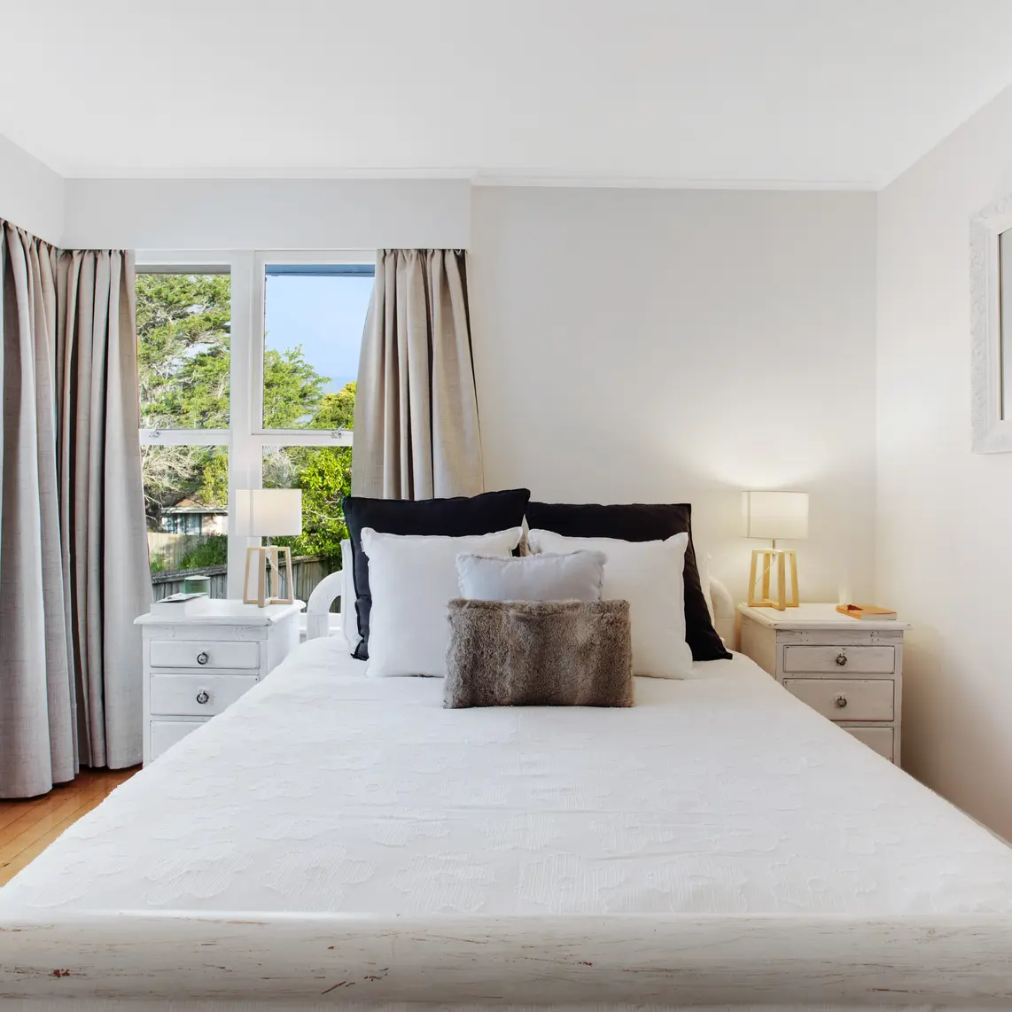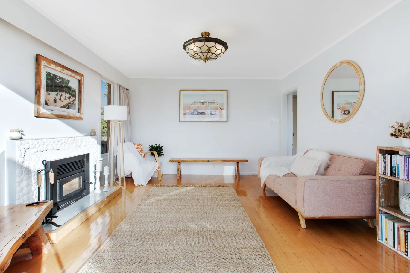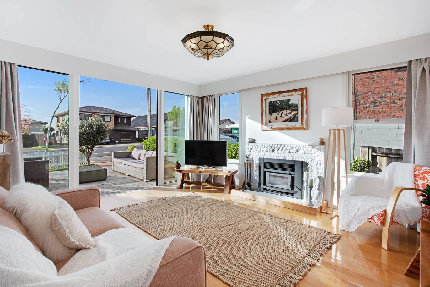 The open living area boasts solid wooden floors and a cozy wood burner, creating an inviting space for year-round living. The front deck, bathed in afternoon sun, is ideal for hosting BBQs and enjoying long summer evenings.